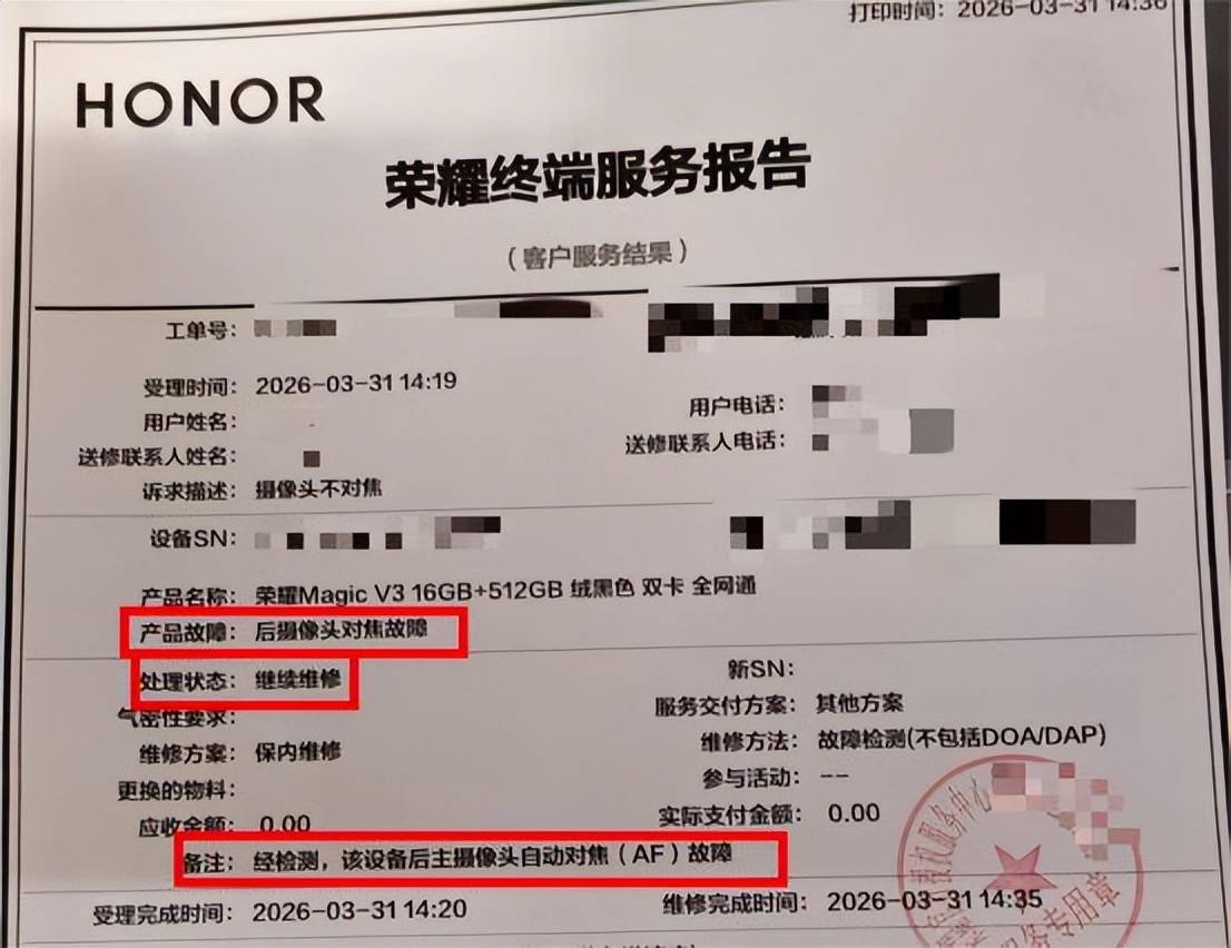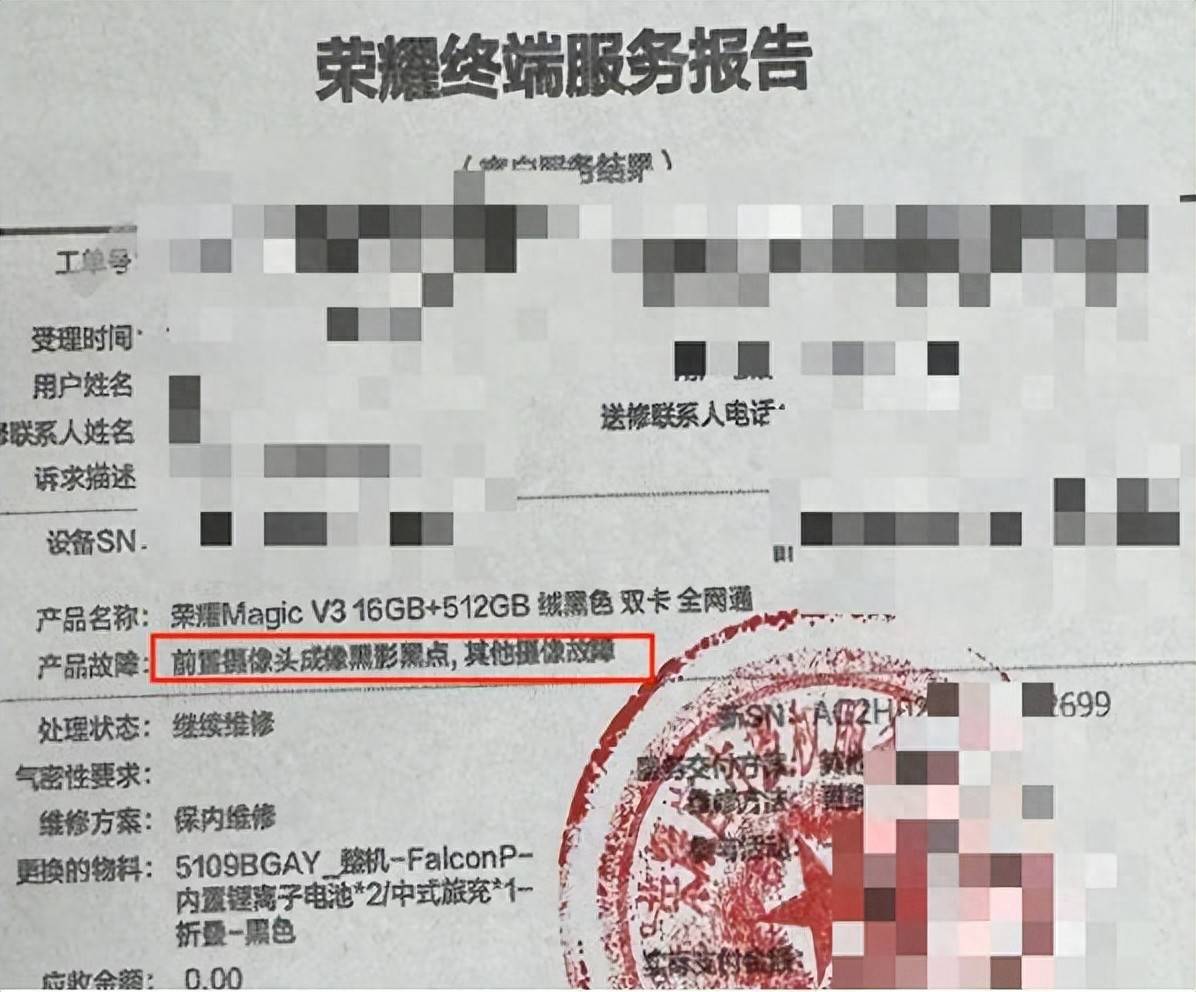 王强照做。但2024年11月他取回手机后发现,前置摄像头模糊。荣耀方面承认系此前维修操作不当所致,经双方多次沟通,荣耀于2024年12月为他更换了一部全新的荣耀Magic V3手机。
