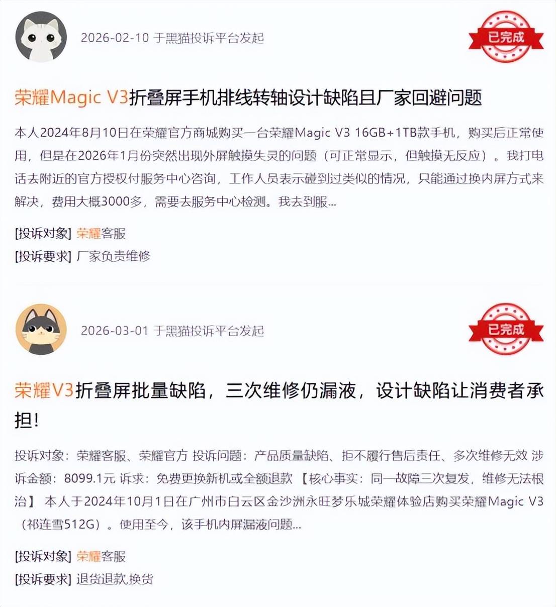 (图片说明:黑猫投诉平台关于荣耀Magic V3投诉的部分截图)