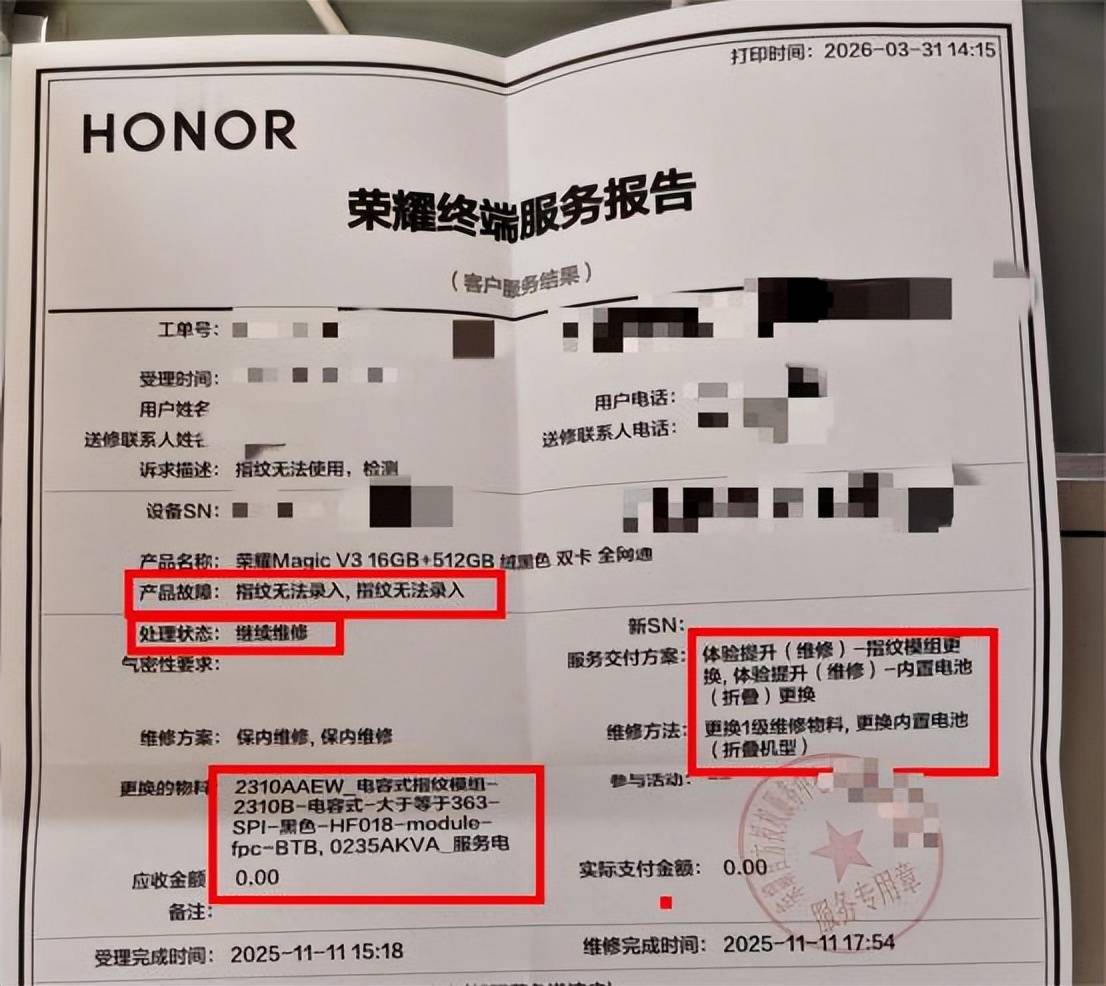 好景不长,2025年9月,王强发现新手机指纹锁又出了问题。他再次前往荣耀授权服务中心检测,工作人员确认此次故障属于商品质量问题,符合保修条件,为其免费更换了指纹模块。