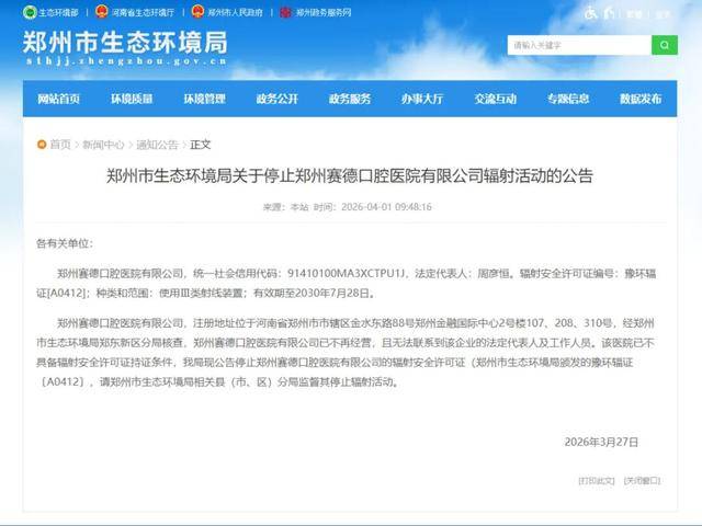 4月1日,郑州市生态环境局在其官网上发布关于停止郑州赛德口腔医院有限公司辐射活动的公告,其中明确提到取消其辐射活动的原因是:“经核查,郑州赛德口腔医院有限公司已不再经营,且无法联系到该企业的法定代表人及工作人员。”