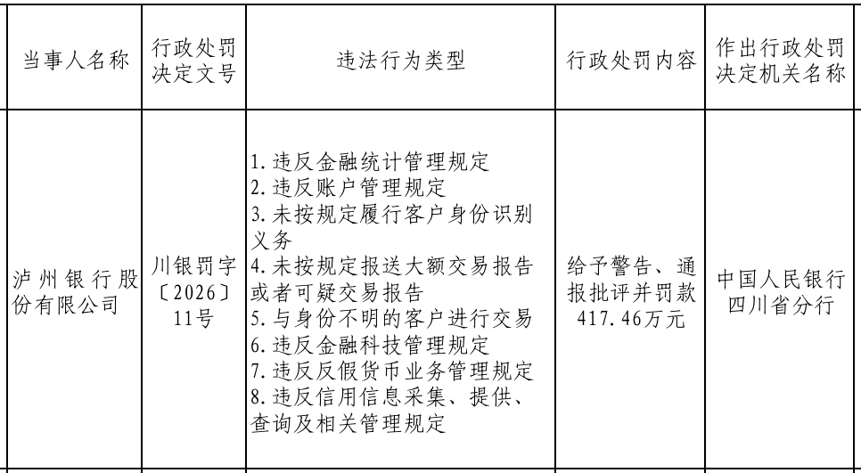 3月20日,中国人民银行四川省分行发布的行政处罚决定信息公示表显示,泸州银行因存在违反金融统计管理规定;违反账户管理规定;未按规定履行客户身份识别义务;未按规定报送大额交易报告或者可疑交易报告;与身份不明的客户进行交易;违反金融科技管理规定;违反反假货币业务管理规定;违反信用信息采集、提供、查询及相关管理规定等8项违法行为,被给予警告、通报批评并罚款417.46万元。同时,泸州银行相关责任人袁某泓以及内控合规部杨某被分别罚款8.5万元。