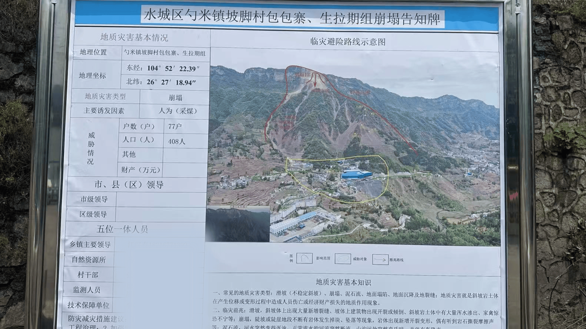 从政府的崩塌告知牌看,坡脚村的地质灾害,主要诱发因素指向人为——采煤。