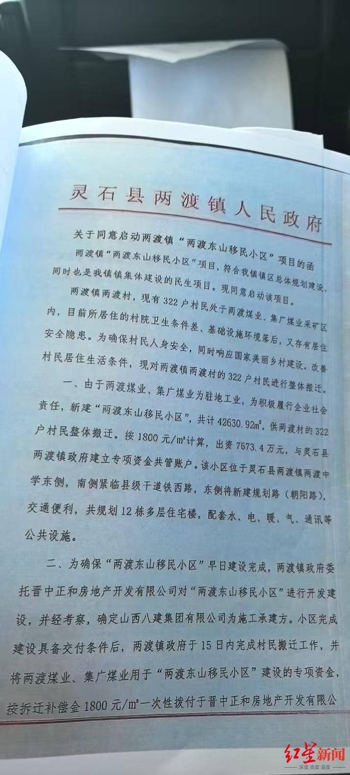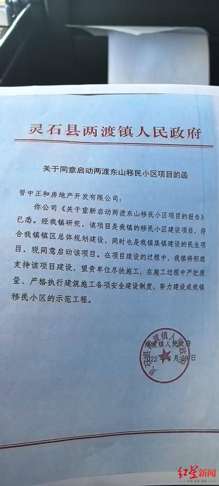 雷女士回忆,在2022年9月左右经朋友介绍后,她从某国企分公司接手“两渡东山移民小区”项目。促使她投资的原因有两点。一是对方公司出示了灵石县两渡镇人民政府《关于启动两渡镇“两渡东山移民小区”项目的函》,对方负责人称,项目有专项资金,接工程后2022年底不管什么情况最少支付总造价的30%。