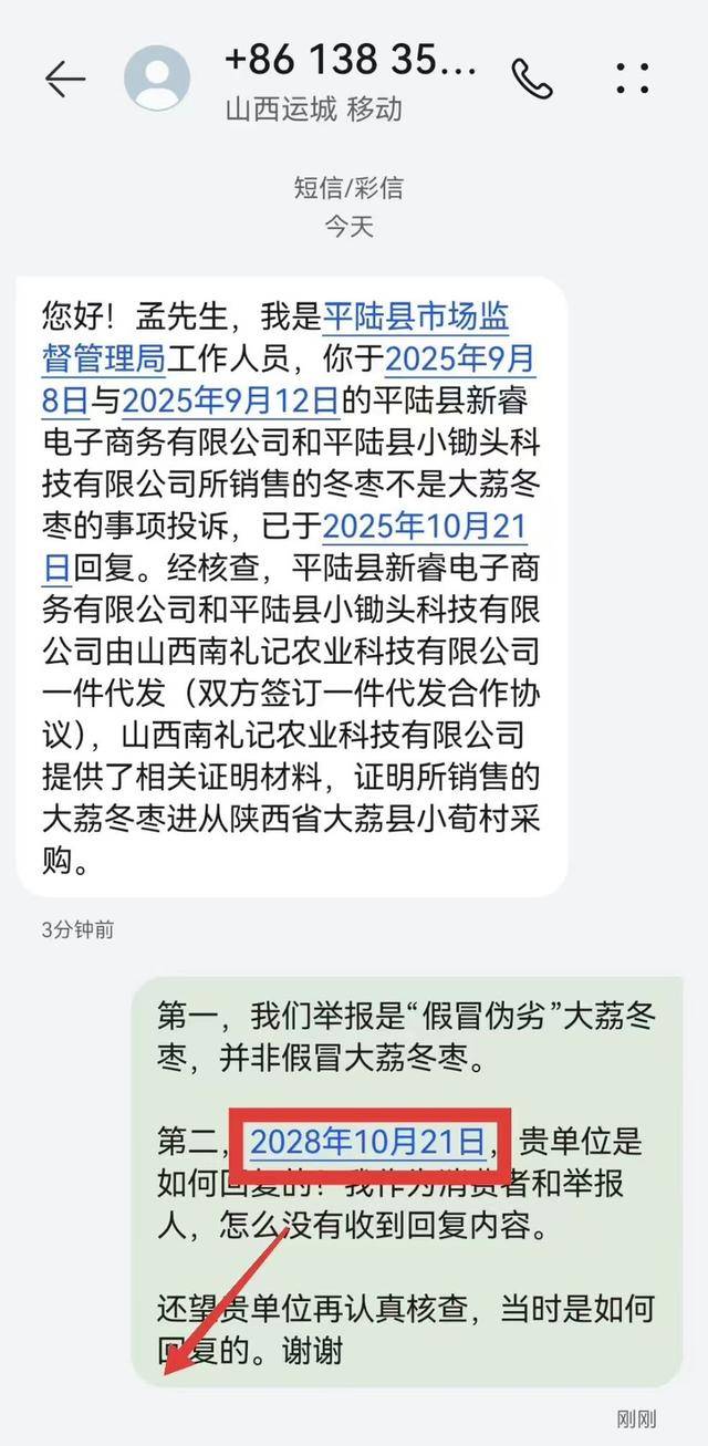 4月10日晚,投诉人孟先生告知记者,他于4月9日与平陆县市场监督管理局联系后,4月10日下午,收到一条自称平陆县市场监督管理局工作人员的短信,短信告知他经核查,山西南礼记农业科技有限公司提供了相关证明材料,证实所销售的大荔冬枣系从陕西省大荔县小荀村采购。