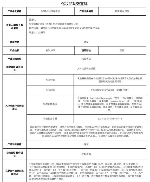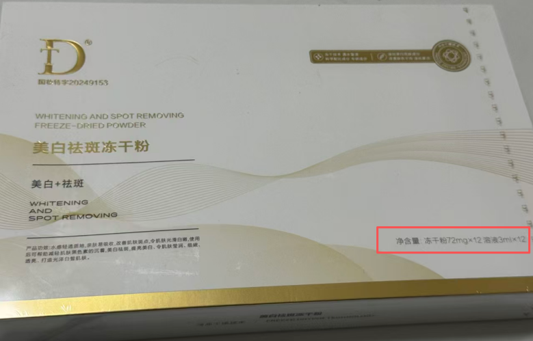 另外,冻干粉产品包装盒上将产品功效描述为:水感清透质地,亲肤易吸收,改善肌肤斑点,令肌肤光滑白嫩,使用后可帮助减轻肌肤黑色素的沉着,美白祛斑,提亮美白,令肌肤莹润、细嫩、透亮,打造光泽白皙肌肤。