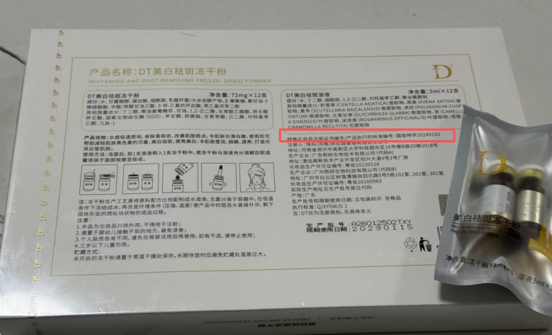 为了解相关产品的实际情况,记者从直播间购买了一套打斑干料。收到货后发现,产品由冻干粉与溶液组成。而包装盒上展示的产品注册/备案号仅有打斑干料的“国妆特字20249153”,未有溶液产品的备案信息。