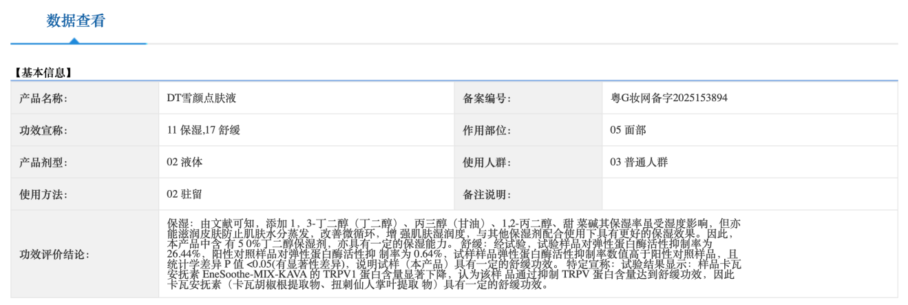 经查询,老二“排斑霜”的备案名称是“DT美白祛斑霜”,注册证号是“国妆特字20233846”;点肤笔的备案名称是“DT雪颜点肤液”,注册证号是“粤G妆网备字2025153894”。