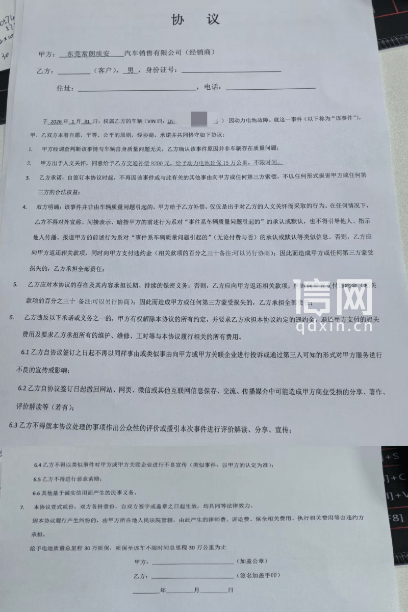 近日,广东的欧阳先生向信号新闻反映,他公司的一辆广汽埃安Y Plus在高速上出现故障,动力、刹车等系统失效。经销商修了46天才修好,送车的时候拿出了一份8200元“交通补偿”的协议,称相关补偿是出于人文关怀,要求欧阳先生认可此前车辆在高速路上发生的故障不是因为质量问题造成,也不得对外宣称或者暗示补偿与车辆质量问题有关。对此,经销商对信号新闻表示,含有“不得传播”等内容的协议是无公章的草拟版本,并非正式有效协议。