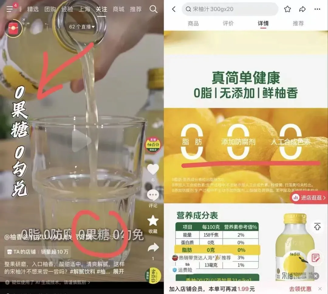 北京云亭律师事务所王琼律师表示,从《反不正当竞争法》第九条视角审视,产品名称“宋柚汁”+商标“宋柚”+柚子元素包装,构成了系统性的商业外观,足以使一般消费者产生“该产品以柚子为主要原料”的合理认知。而实际2.7%的柚子含量,与这一认知存在显著落差,符合“引人误解的商业宣传”构成要件。