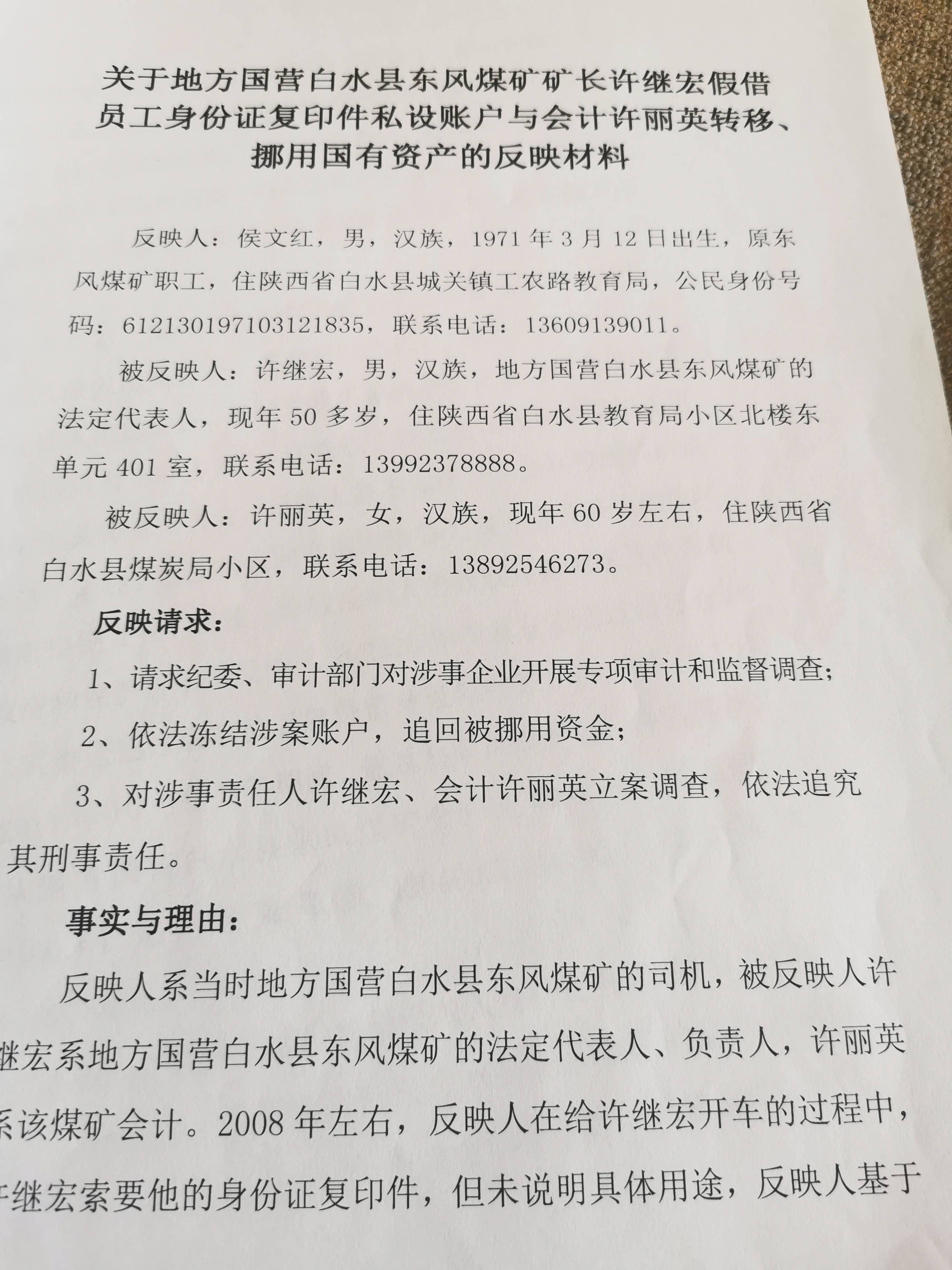 然而,截止2026年4月初,上述法院判决所产生的还款义务,东方新实业及东方煤矿并未履行。无奈侯某曾采取上访方式寻求解决,但曾经逐级上访至白水县、渭南市、陕西省等相关部门,亦未解决。侯某不得不进京上访,才得到当地部门的回应。不过,白水县相关部门,将侯某从北京骗回当地,仅以几个月后的一万元维稳费打发。 侯某后来通过相关部门查询到,该矿负责人许继宏曾借侯某身份证开始的银行账户,进行企业资金转账,2008年1月至2011年10 月,通过与东风矿会计许丽英合谋。从白水县东方煤矿公户上向私户上现金取款达到1600元万元,转账取款4000余万元。