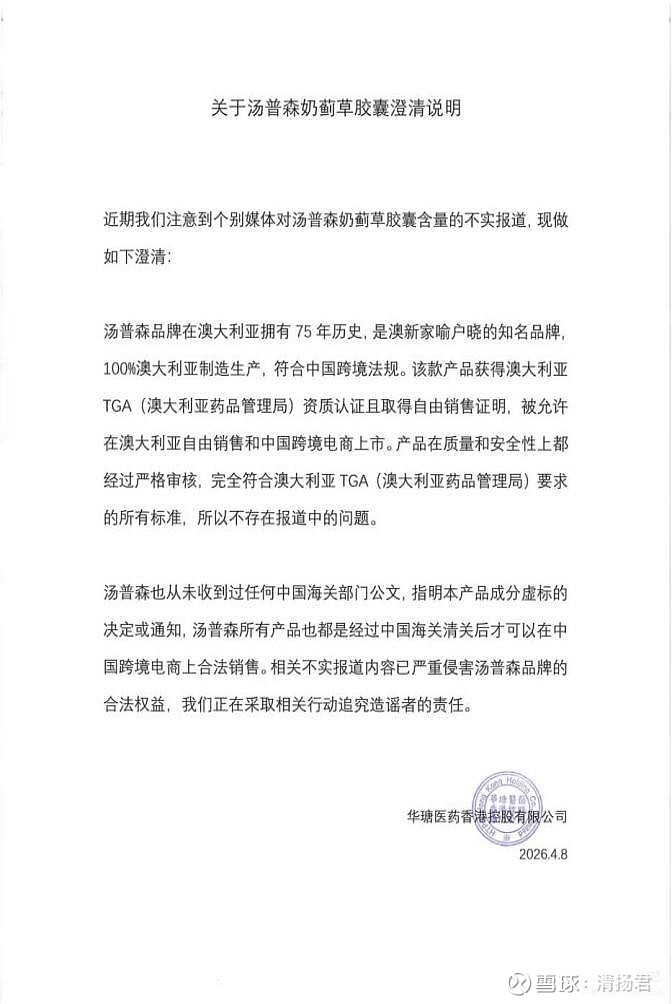 不过,汤普森官方账号于4月8日和10日两次发布声明,指出相关报道不实,强调其产品成分含量符合澳大利亚药品管理局的审核与注册要求,并表示将追究造谣者的责任。声明中还称,自身产品合规,且从未收到过任何中国海关关于成分虚标的通知。