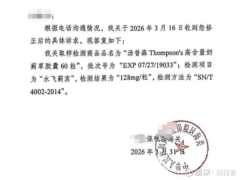 事实上,早在媒体曝光之前,官方抽检就已发现问题。3月31日,某保税区海关在接到消费者投诉后对汤普森产品进行了抽检,书面回复结果显示,其每粒水飞蓟宾含量仅有128毫克,进一步证实了成分虚标的情况。
