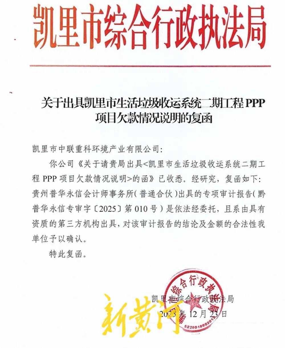不过,虽然早已开始审计,但直到2025年12月,凯里市综合行政执法局才就项目欠款情况向凯里中联重科复函。复函中写有:“对该审计报告的结论及金额的合法性我单位予以确认。”