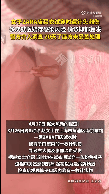 此前,有网友发视频称在上海一家ZARA门店试穿裤子被口袋内的针头扎伤。