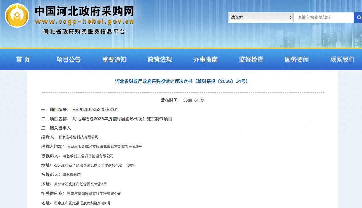 近日,河北省财政厅发布政府采购投诉处理决定书(冀财采投〔2026〕34号),认定河北博物院2026年度临时展览形式设计施工制作项目中标供应商石家庄景想展览装饰工程有限公司,不满足招标公告规定的供应商资格要求。因该项目政府采购合同已履行完毕,相关当事人仅可通过法律诉讼途径维权,由相关责任人承担赔偿责任。