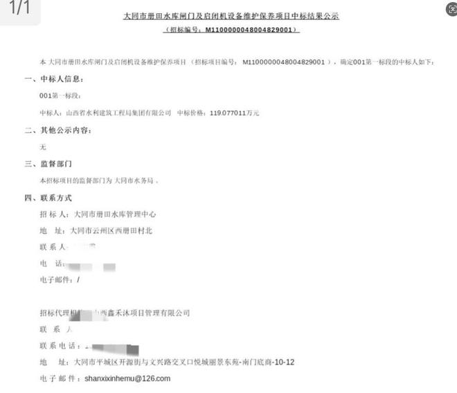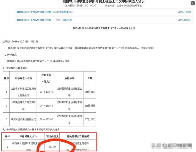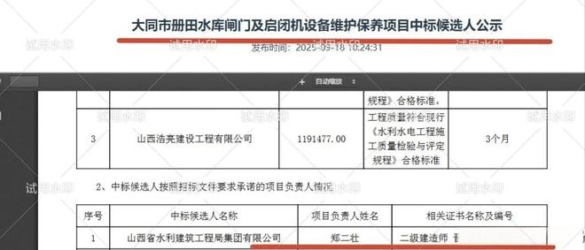 事件回溯至 2025 年 9 月 22 日,山西省水利建筑工程局集团有限公司中标 “大同市册田水库闸门及启闭机设备维护保养项目”,中标金额 119.077011 万元,拟派项目经理为郑二壮。然而中标仅 10 天后,该公司同一项目经理郑二壮又参与投标 “隰县城川河水生态保护修复工程施工(二次)” 项目并成功中标,中标金额达 2942.183946 万元。