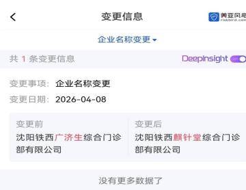 记者查询工商变更信息发现,2026年4月8日,“沈阳铁西广济生综合门诊部有限公司”正式完成企业名称变更,更名为“沈阳铁西麒针堂综合门诊部有限公司”。距央视3.15晚会播出,仅约3周时间。