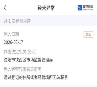 曝光之后,广济生综合门诊公司迅速陷入“失联”状态。工商信息显示,2026年3月17日,沈阳市铁西区市场监督管理局以“通过登记的住所或者经营场所无法联系”为由,将该公司列入经营异常名录。