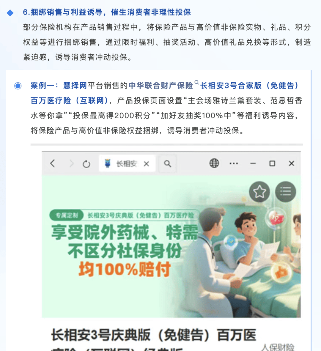 该《报告》所举典型案例为:慧择网平台销售的中华联合财产保险长相安3号合家版(免健告)百万医疗险(互联网),产品投保页面设置“主会场雅诗兰黛套装、范思哲香水等你拿”“投保最高得2000积分”“加好友抽奖100%中”等福利诱导内容,将保险产品与高价值非保险权益捆绑,诱导消费者冲动投保。