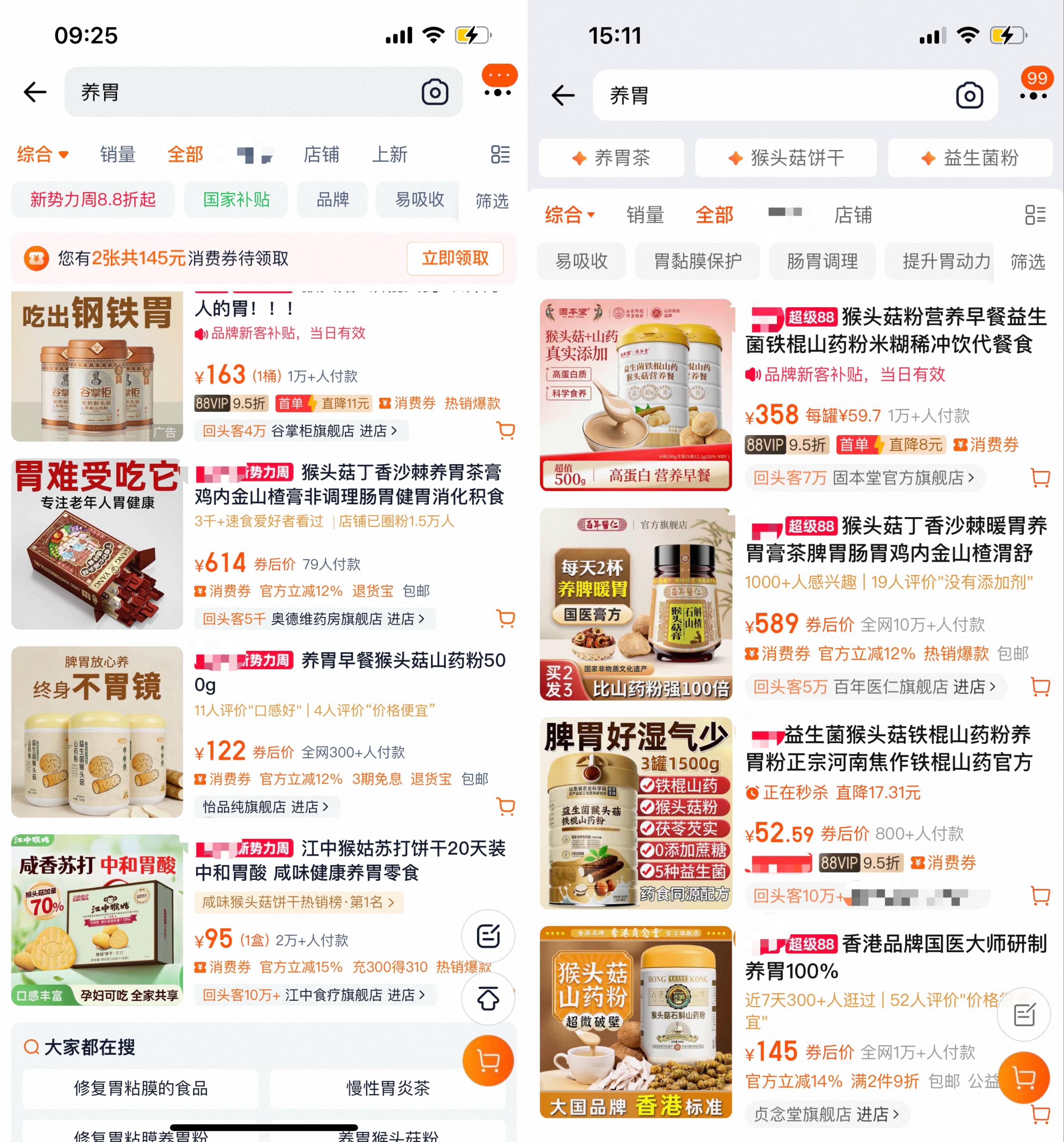 4月17日,电商平台搜索结果页和多个店铺中(右图),此前“吃出钢铁胃”等夸张营销内容(左图)已删除。平台截图