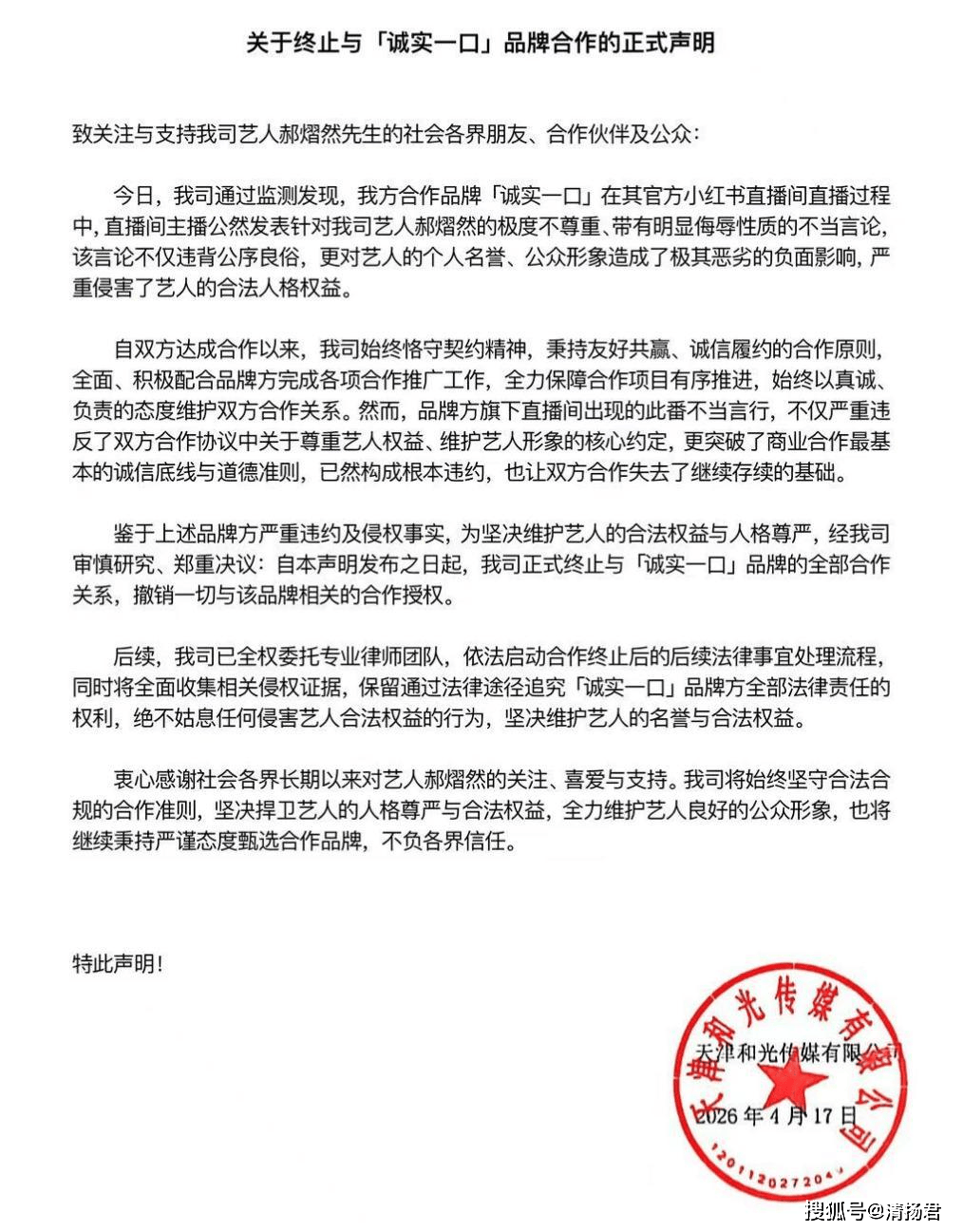 郝熠然所在的和光传媒显然没打算吃这个哑巴亏,第二就发布终止合作的声明。声明直指“诚实一口”主播言论严重违反合约中“尊重艺人权益”核心条款,构成根本违约,立即终止与“诚实一口”的全部合作并撤销授权,法律程序同步启动。