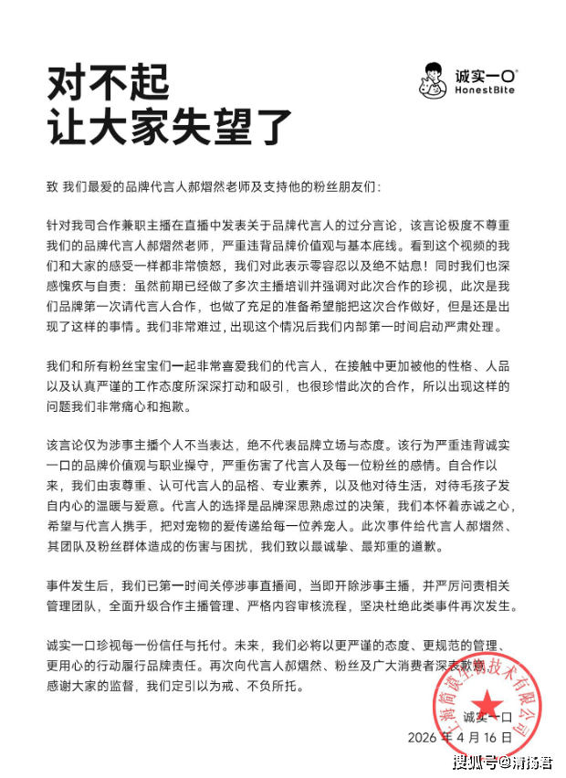 事情发酵的速度比想象中更快。“诚实一口”当晚关停直播间、开除主播、连续发声道歉三次,甚至创始人吕依凌也站出来道歉,一套危机公关组合拳打得行云流水。但问题是——这管用吗?