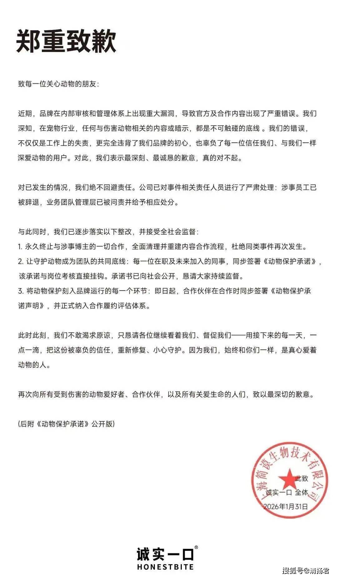 早在今年1月31日,该品牌因合作方推广内容涉及虐猫嫌疑而引发众怒。作为宠物食品品牌,触碰“虐猫”这条红线无疑是致命的。当时,品牌方的反应迅速且决绝:不仅立即道歉并终止合作,创始人吕依凌和姚懿还高调签署了《动物保护承诺》,承诺杜绝一切美化或戏谑动物痛苦的行为。当时看来,这一系列整改措施雷厉风行,干净利落,似乎展现了品牌痛改前非的决心。