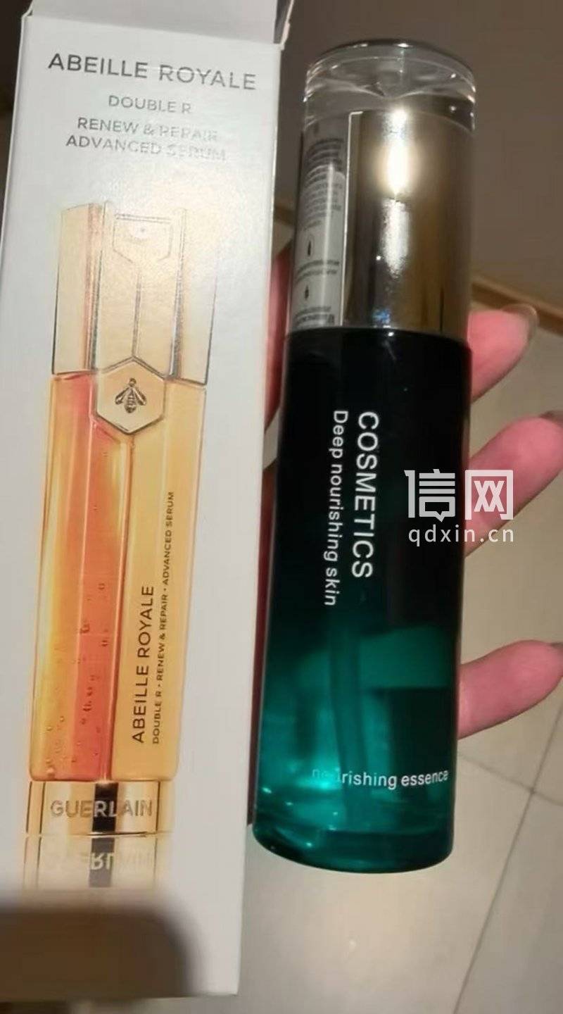 信号新闻从林女士提供的图片中看到,这个绿色瓶子上面最醒目的“COSMETICS”字样并非品牌,而是化妆品的英文单词。另外的两段字体较小的外文,也与品牌无关,只是“深度护理皮肤”“滋养精华”等护肤术语。