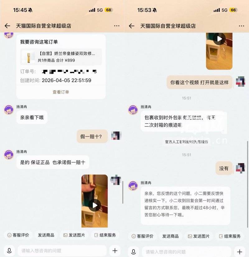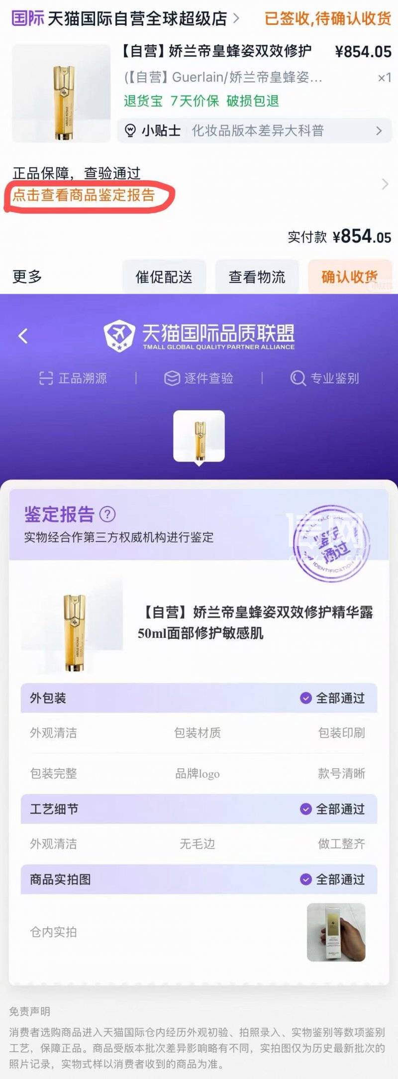 据林女士介绍, 4月5日,她在天猫国际自营全球超级店下单了“【自营】娇兰帝皇蜂姿双效修护精华露50ml”,实付金额854.05元。下单后,林女士看到商品页面明确标注“正品保障,查验通过”,并承诺“假一赔十”,平台还附带了天猫国际品质联盟的鉴定报告,这些内容让她确信自己买到的一定是娇兰正品。