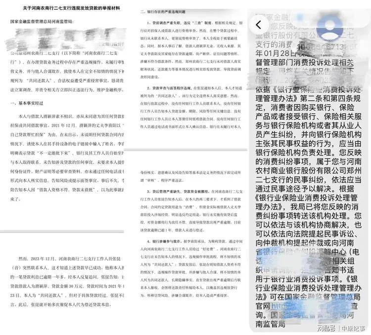 2026年1月22日,时仁义就此事向国家金融监督管理总局进行投诉。当日,河南农商银行郑州二七支行信贷员立即联系他,称投诉“没有用,改变不了你是共同还款人的法律关系”。1月28日,国家金融监督管理总局河南监管局短信回复称,已将“消费纠纷事项”转送银行处理,对“违规放贷”问题未作提及。至今,银行尚未向时仁义出示贷款相关的全套合规审查资料。