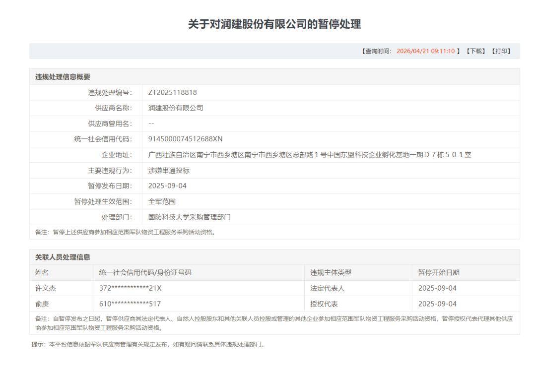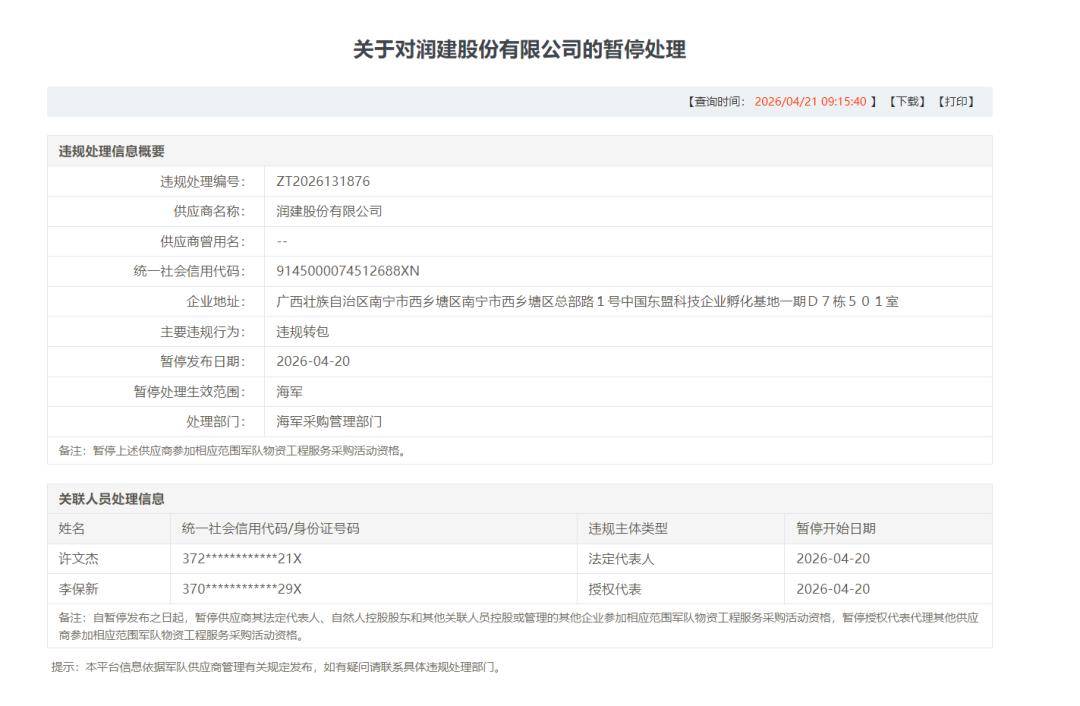 4 月 20 日,军队采购网发布最新处罚公告,润建股份有限公司因项目违规转包失信问题,被暂停海军范围物资、工程及服务采购参与资格,处罚自当日起正式执行。