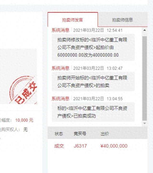 2021年3月22日,临沂河东农商银行将临沂中亿重工6000万元不良资产债权,挂在中拍平台上拍卖。