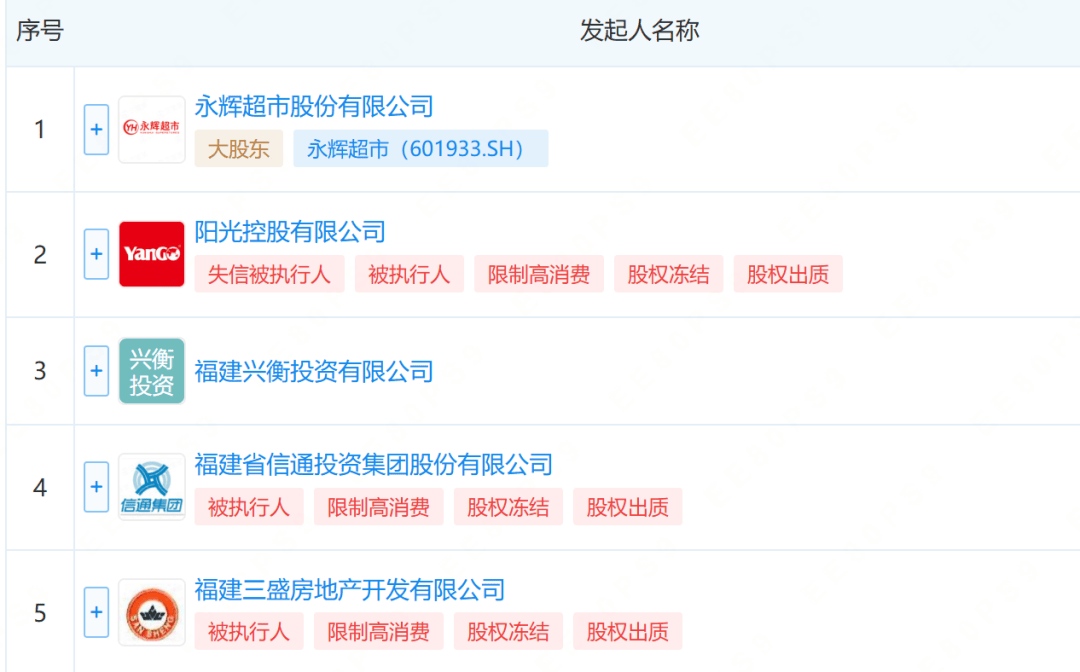 华通银行的股东阵营看似豪华——永辉超市、阳光控股、兴衡投资、信通集团、三盛地产、三棵树、盼盼食品、圣农食品,均为福建知名企业,但多位股东存在债务问题,股权大面积冻结。