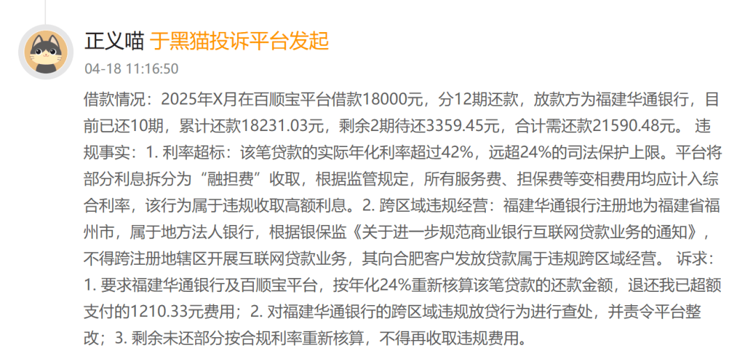 该用户表示,要求福建华通银行及百顺宝平台,按年化24%重新核算该笔贷款的还款金额,退还我已超额支付的1210.33元费用;对福建华通银行的跨区域违规放贷行为进行查处,并责令平台整改;剩余未还部分按合规利率重新核算,不得再收取违规费用。