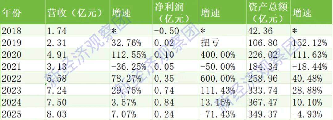 总资产方面,2018-2025年,华通银行保持了缓慢扩张态势,其中2019年和2020年增速一度超过100%,但2021年资产缩水18.44%。2022-2024年总资产继续扩张,但增速逐步下跌到10.1%,2025年再次陷入负增长。
