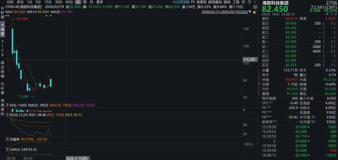 出人意料的是,在这场风暴中,海致科技被推至聚光灯下。这家2026年2月26日上市的“AI除幻第一股”,股价走势与包盘特征高度吻合。