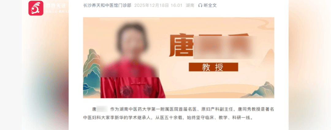 记者留意到,长沙养天和中医馆门诊部于2025年12月发布了一篇专家坐诊文章,医生唐某某将于周一至周日全天出诊。