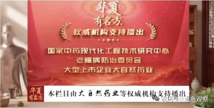 第一步:拉大旗作虎皮节目一开场,“国家中药现代化工程技术研究中心”“老慢病防治委员会”“大型上市企业大自然药业”“江西省药物研究所”等权威机构名号滚动播放。“国家中药现代化工程技术研究中心”确实存在。它是经国家科技部批准、依托丽珠医药集团和广州中医药大学组建的国家级研究机构,是我国中药行业最早的四大骨干研究中心之一-。