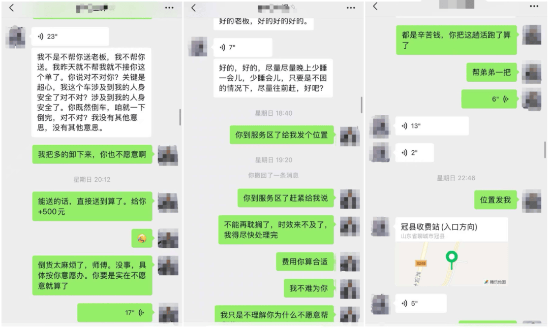 卫先生跟对方商量,但司机表示不给钱就不能卸货,也拒绝发送自家位置。卫先生提供的聊天截图显示,当事司机提到若卫先生不同意,可以报警或起诉。卫先生考虑到货物的保质期,只得转钱。之后拿到货物定位,卫先生另外找车约定了4500元的运费,并额外支出700元的装卸费用后,在次日凌晨4点左右完成货物交接。