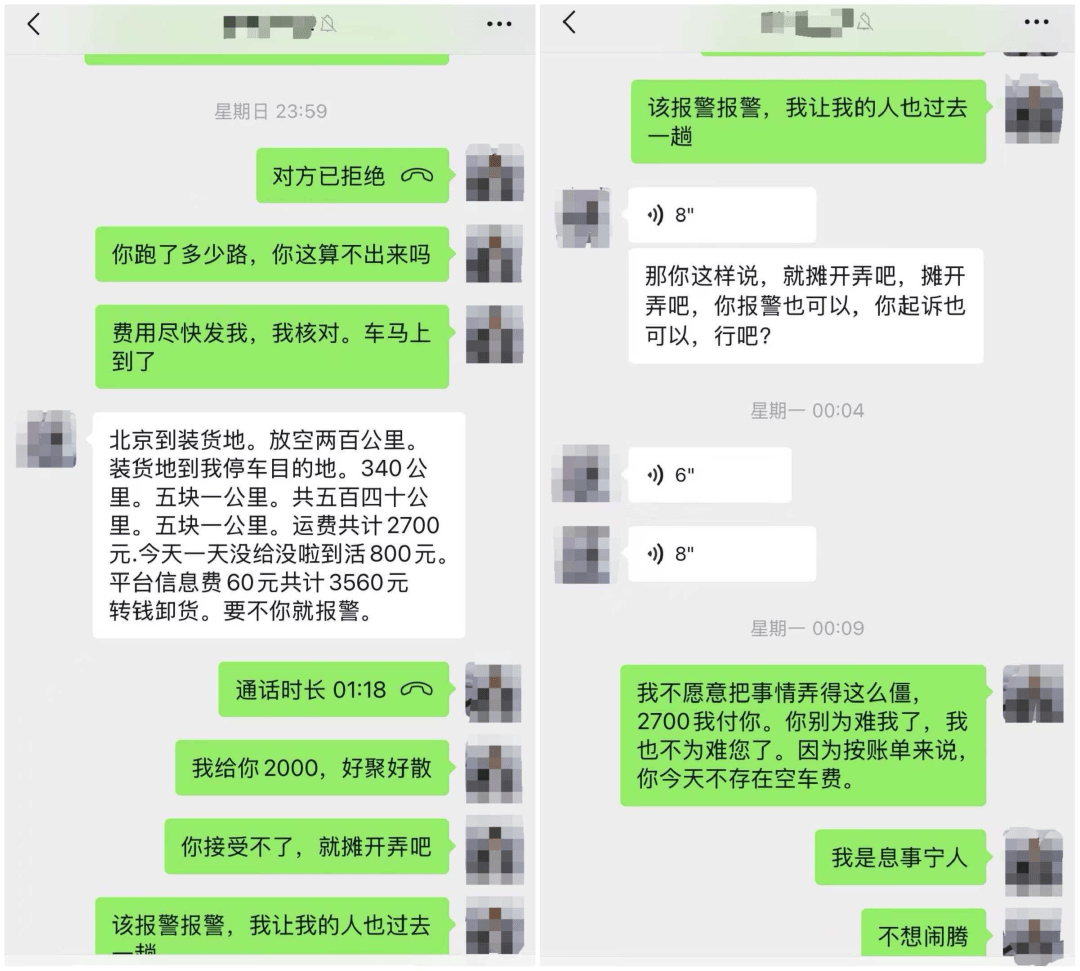 卫先生说,无奈之下,他只好等待对方的消息,“最后他绕了100多公里路把货拉到他自己家里去了。”卫先生说,直到此时,对方依然不告诉他货物所在地址,而是核算了费用,包括装货前的空驶路程200公里、装货后跑的340公里,共计540公里,按照每公里5元核算,再加上当日误工一天算800元费用,平台信息费60元,合计3560元,“这趟货运总共才4000元运费,现在要这么多,这不是天价吗?”