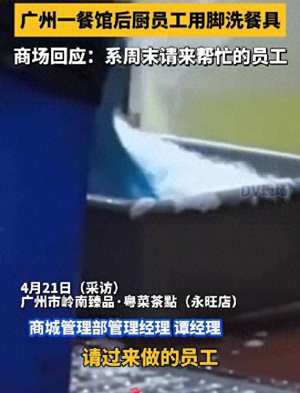 近日,有网友在社交媒体发布了一则视频,广州一餐厅内,有员工穿着水鞋用脚洗餐具。