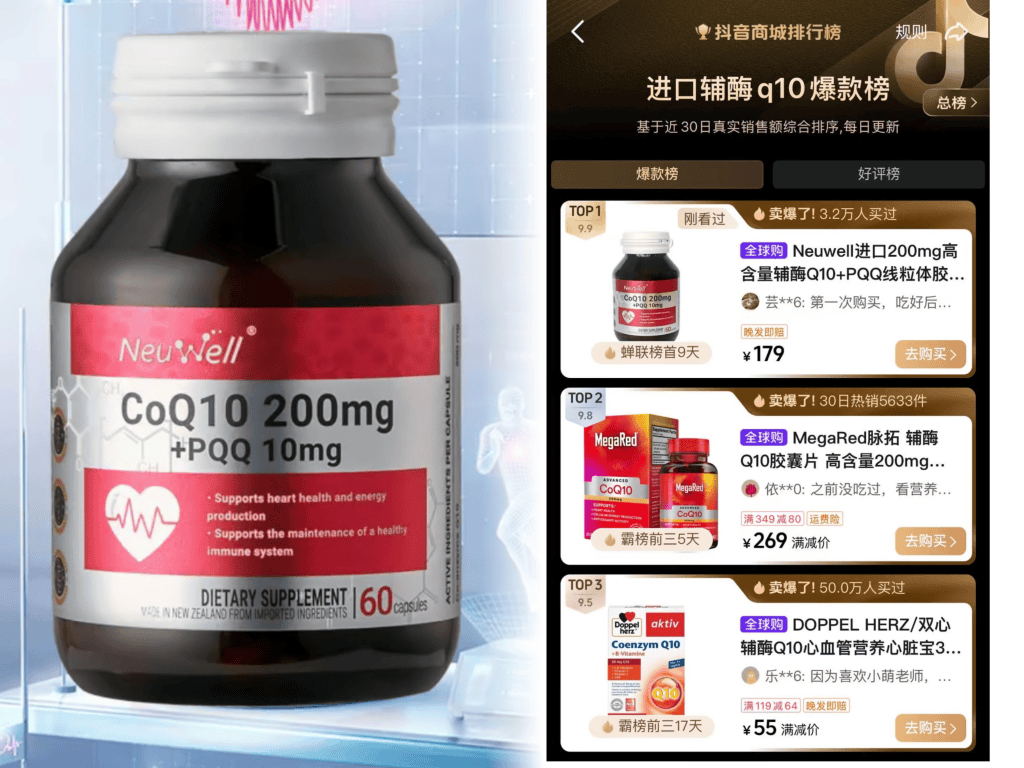 在抖音商城进口辅酶Q10爆款榜单中,NeuWell品牌曾蝉联榜首。产品截图