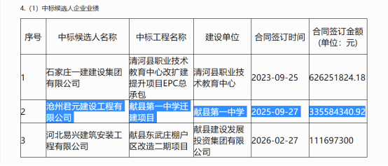 2026 年 3 月 23 日,河北省招标投标公共服务平台发布的“河北献县经济开发区食品产业园基础设施建设项目一标段”中标候选人信息显示,沧州君元建设在本项目投标阶段,提交的企业业绩为献县第一中学迁建项目(简称一中迁建项目)。经核实,沧州君元建设确于 2025 年 9 月 23 日中标该项目,中标金额 33558.434092 万元,约 3.35 亿元。其中标公告标注,该项目计划工期 24 个月,截至目前仍处于在建施工阶段,尚未竣工验收。这意味着,沧州君元建设使用尚未完工在建项目作为投标业绩参与新项目竞标。