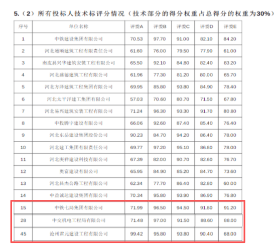 反观同期竞标对手,其余两名中标候选人为行业头部央企:分别是具备建筑工程一级资质的中交机电工程局有限公司、拥有施工特级资质的中铁七局集团有限公司。但在一中迁建项目评分过程中占总分权重 30% 的技术评分环节,同一评标委员会评委为沧州君元建设打出 99.42 的技术高分,而两家老牌央企技术评分仅 71 分上下,单项分差高达 28 分。最终,沧州君元建设凭借 96.53 分的综合总分,中标大额项目。