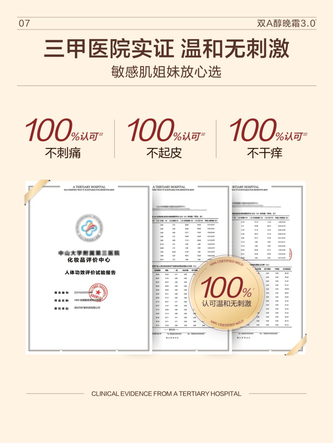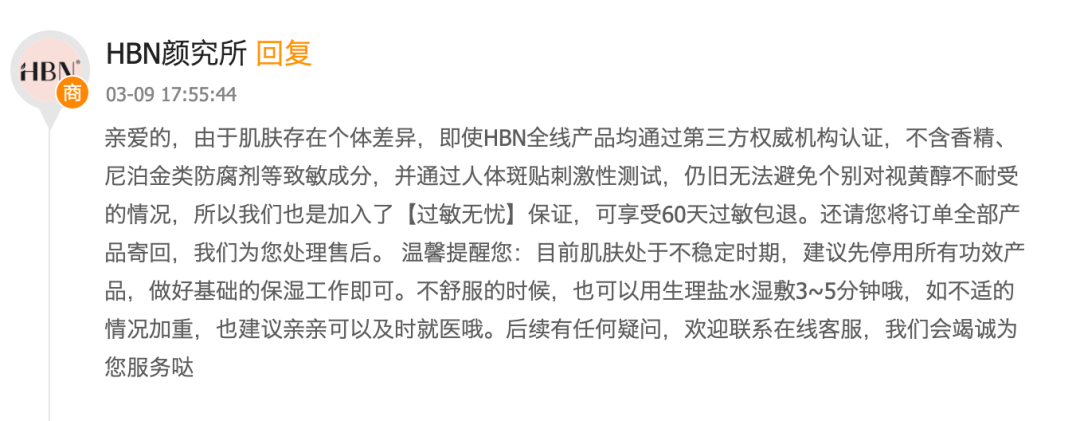截至发稿,HBN官方账号在黑猫投诉平台的回复内容已被设置为“已隐藏”,但据此前同类投诉的回应,HBN解释,其设有“60天过敏包退”机制,并强调产品在上市前经过了人体皮肤斑贴测试及人体功效评价测验,符合国家法规要求。但回复同时承认,“由于个体肤质差异较大,无法避免个别对视黄醇(A醇)不耐受的情况”。