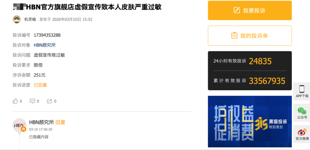 值得注意的是,有消费者在投诉中明确引用HBN产品宣传语“100%温和无刺激”,称使用后却出现严重过敏,质疑品牌存在虚假宣传。业内人士指出,若该宣传语属实,涉嫌违反《广告法》关于禁止使用绝对化用语的规定。