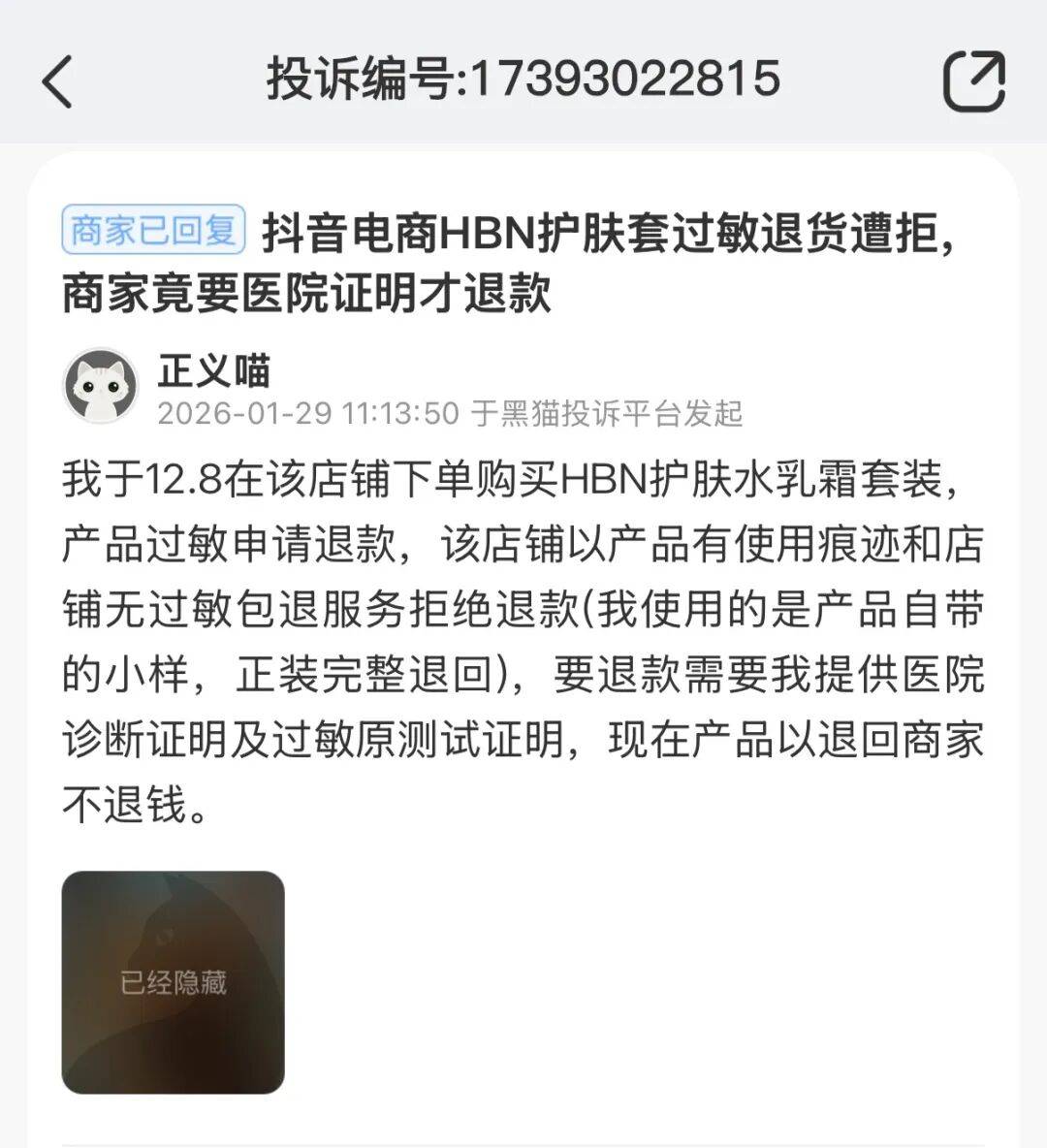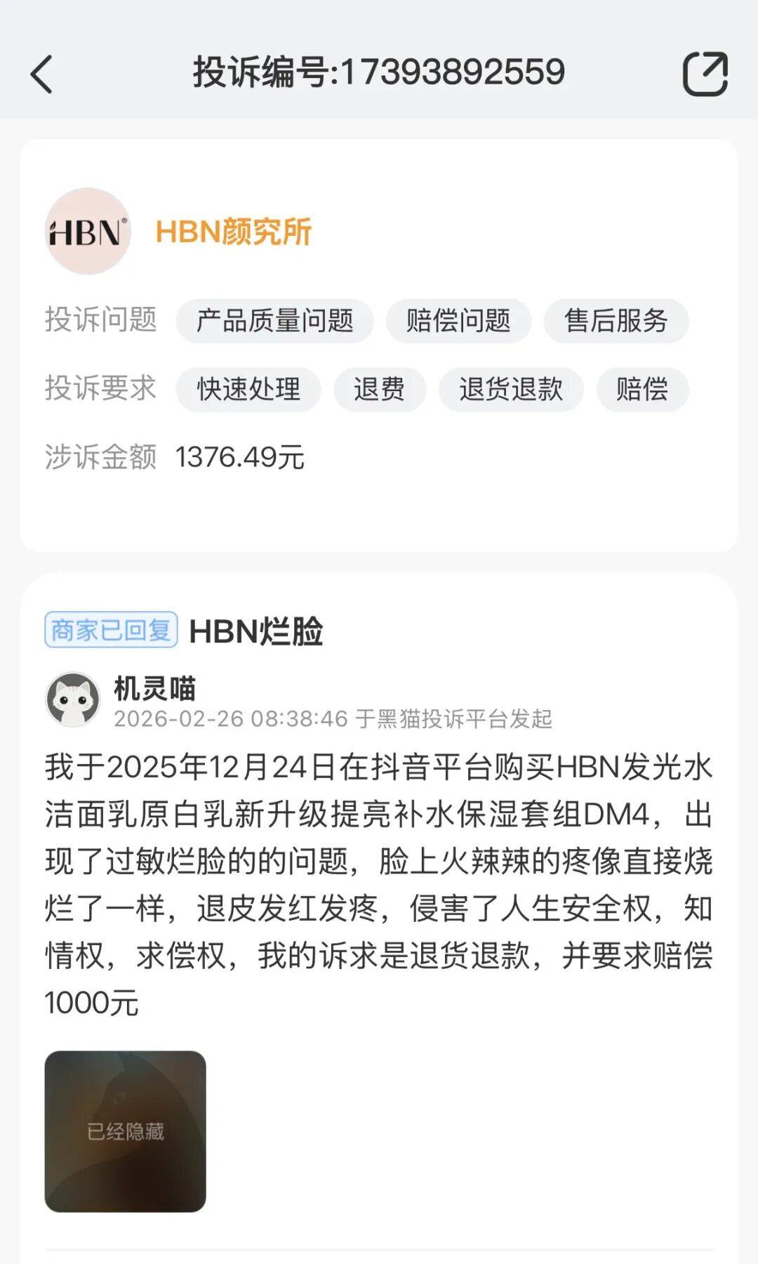 在黑猫投诉等平台,HBN相关投诉累计已达数百条,问题集中在皮肤过敏、售后推诿、宣传与实际不符、退款难等多个方面,不少消费者的吐槽,直指品牌重营销、轻售后。