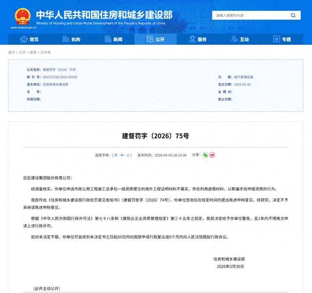 近日,住房和城乡建设部公示了建督罚字〔2026〕75号行政处罚,处罚公文显示:经调查核实,巨匠建设集团股份有限公司申请市政公用工程施工总承包一级资质提交的境外工程证明材料不属实,存在利用虚假材料、以欺骗手段申报资质的行为。
