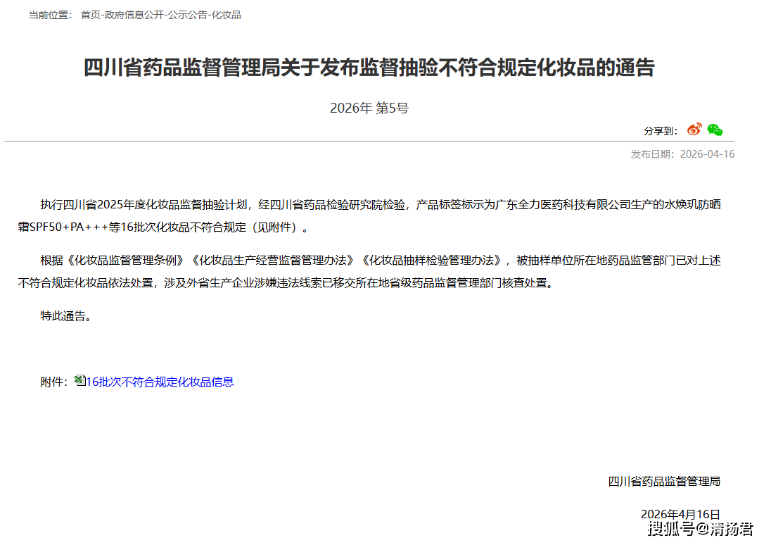 2026年4月16日,四川省药品监督管理局通报了16批次不符合规定的化妆品,其中由钟楚曦代言、被LVMH集团旗下私募基金L Catterton收购的施丹兰,其“海藻净透补水深湖泥面膜”(备案号:国妆网备进字(京)2022000438)被检出铅含量为17mg/kg,超出《化妆品安全技术规范》中铅含量≤10mg/kg的限值要求,超标幅度达70%。