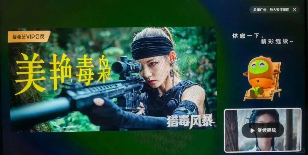 “打开正规平台追剧,暂停后突然弹出这种画面,第一反应以为点进了非法网站。” 网友吐槽,广告画面冲击力很强。